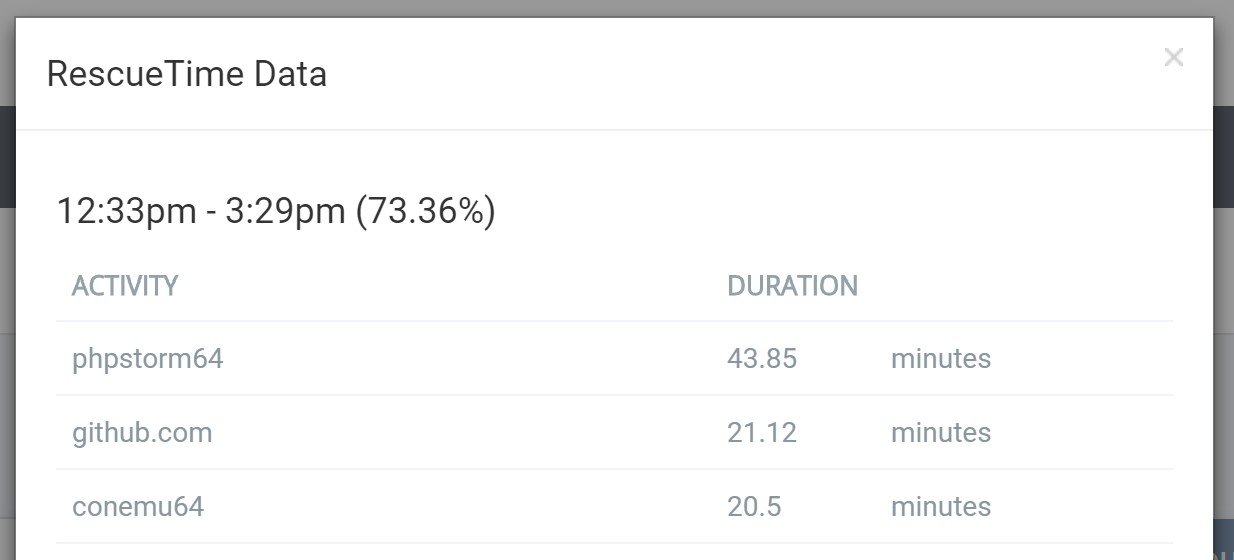 Once you have synced Log My Hours with RescueTime, your timesheet entries will show how productive you were in the given time period. You can also click on it to get a complete breakdown, which is pictured below.